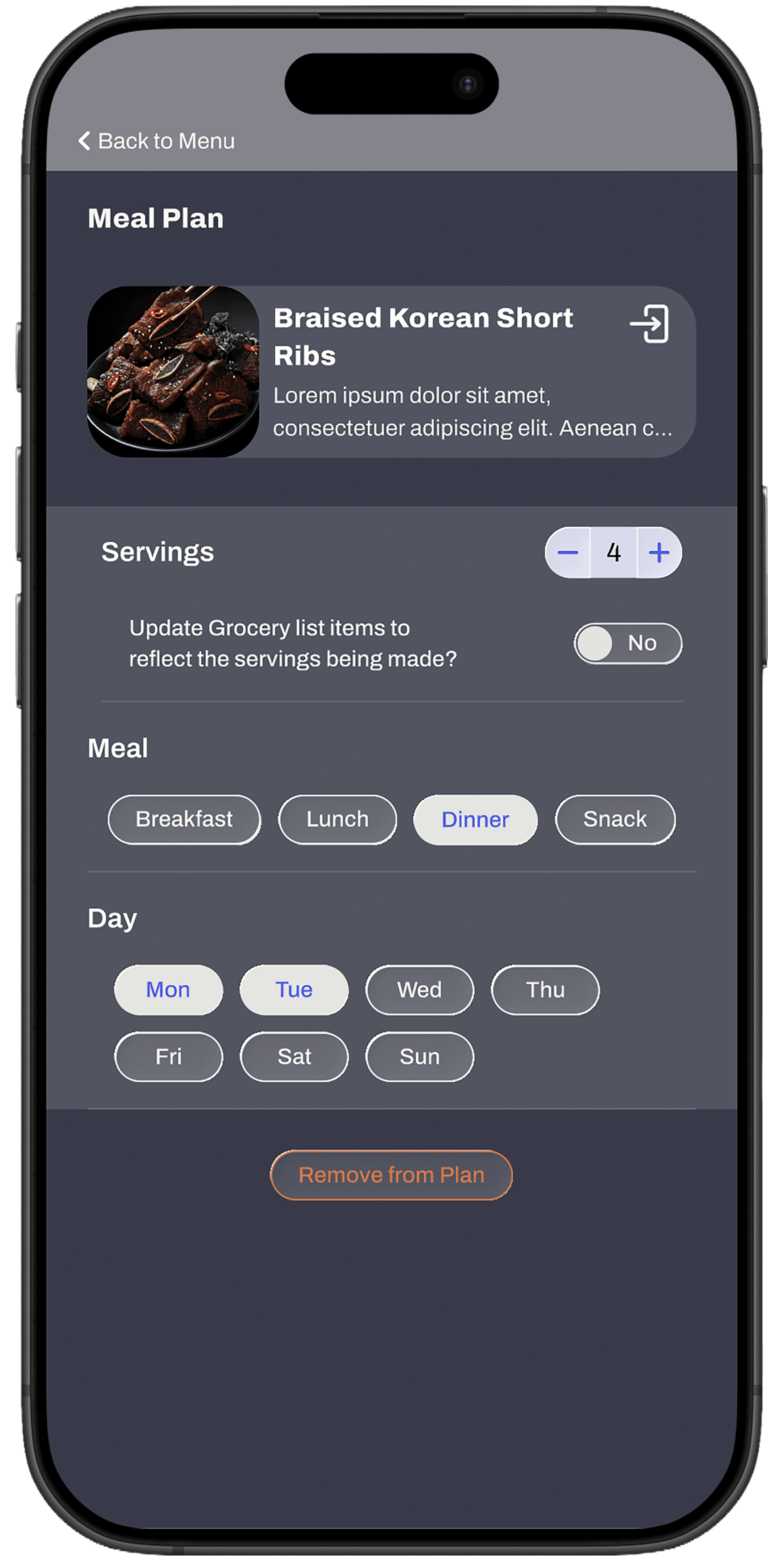 Having ingredients at home when it's time to make a meal was another common struggle for many survey participants. The grocery list and planning feature are both designed to make a trip to the grocery store more effective, hopefully with less trips to the store.